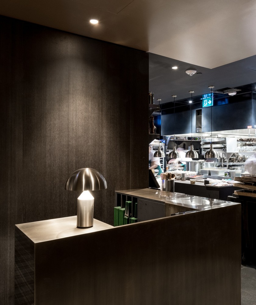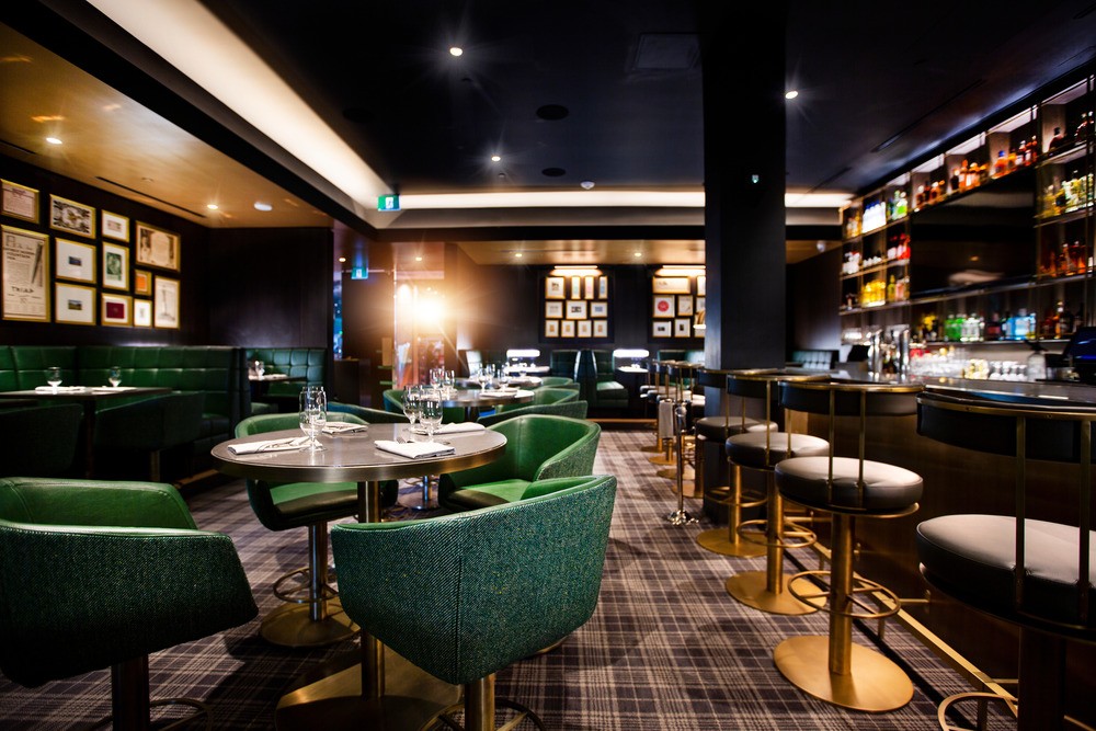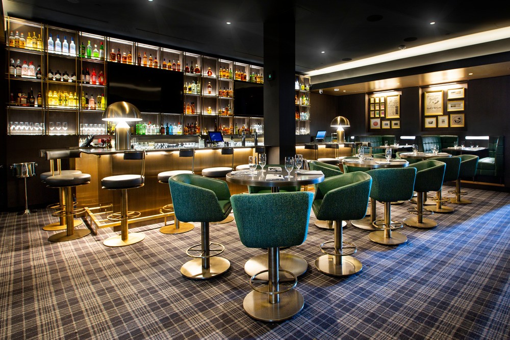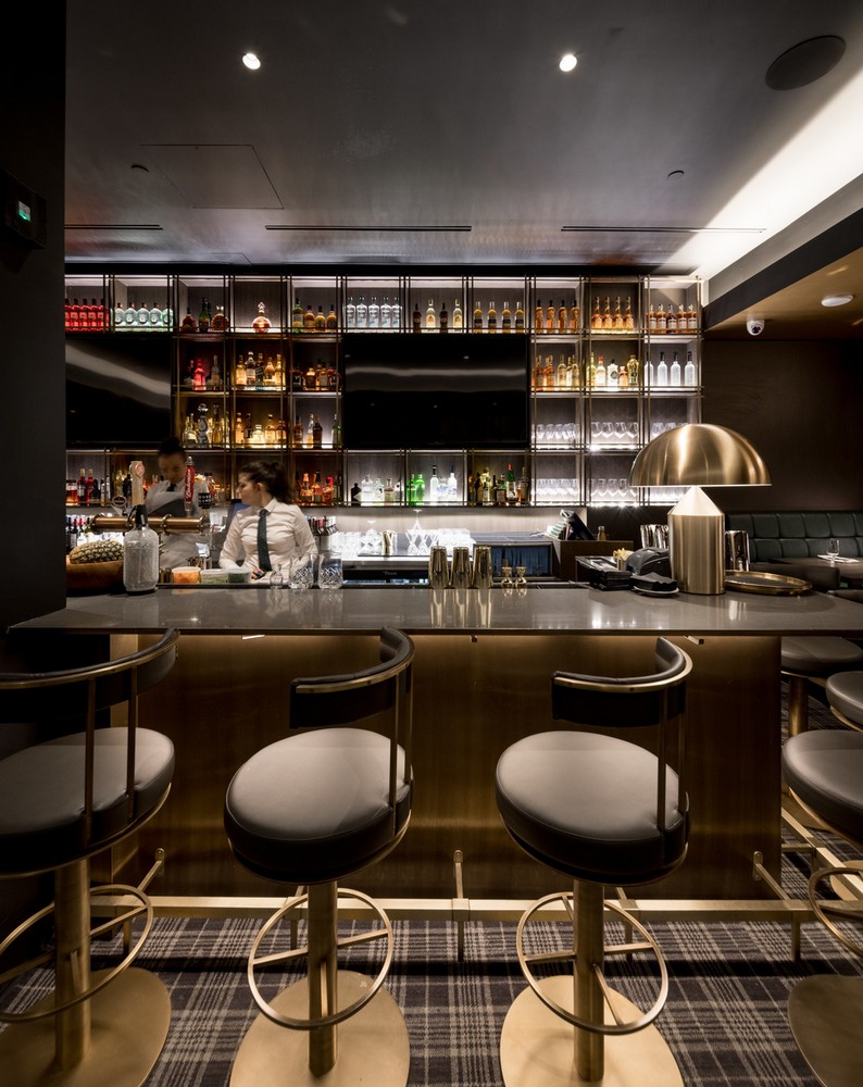 The octagon’s center dome is constructed out of bronze patina, which draws the eye inward, while at the same time housing the lighting and mechanical details. Bronze is also used throughout much of the space, including in the bar and lounge area, which features a welded bronze tartan display used to house bottles and glasses. In addition, the solid bronze panels in the main dining room bar have all been hand-painted to create a bespoke finish and add a decorative accent throughout the large dark space.