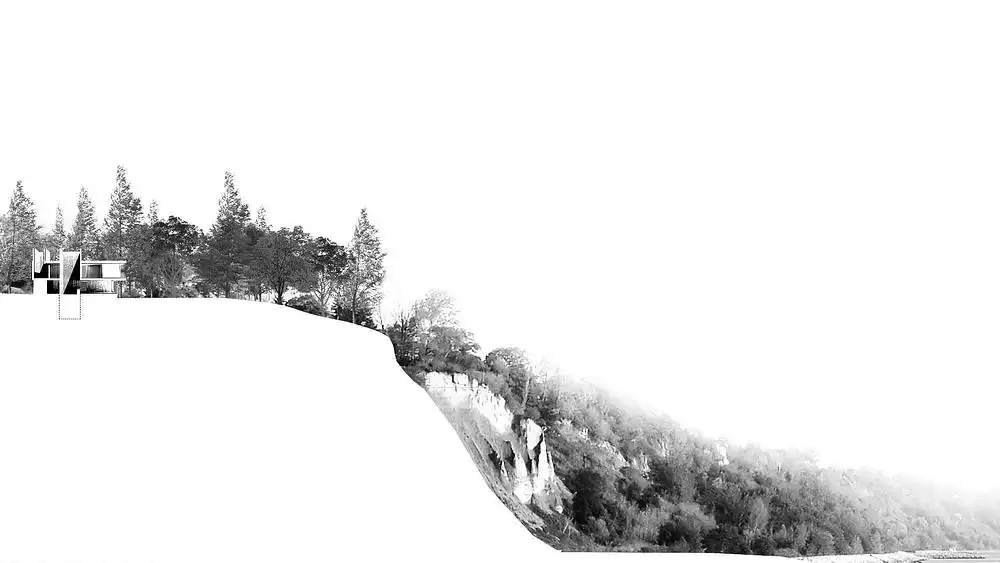 From the sandy soils of the bluff, concrete volumes emerge as inhabitable shoring, forming the structural and spatial framework of the house, while responding directly to unstable soil conditions and minimizing disturbance to the escarpment. Above, a wood volume is cantilevered toward both the street and the lake.