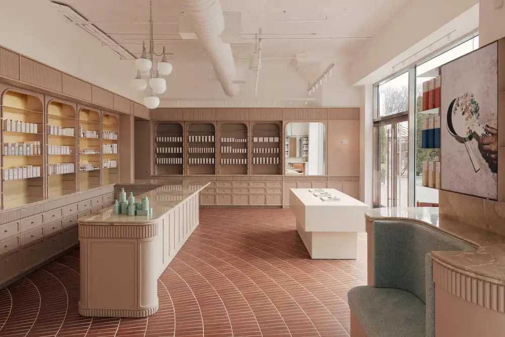 Departing from the dark wood of traditional apothecaries, the clay-toned millwork espouses a light, uniform backdrop for different products and branding, anchored by Breccia Oniciata marble that transforms each bay into its own service counter. Rounded tambour