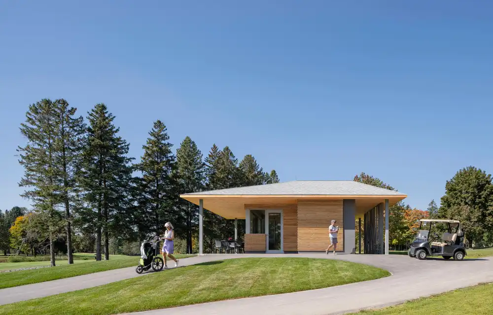 The Golf Pavilion at the Ladies’ Golf Club of Toronto in Thornhill, Ontario, situated at the halfway point of the golf course, serves as a rest stop offering amenities such as snacks, beverages, and washroom facilities.