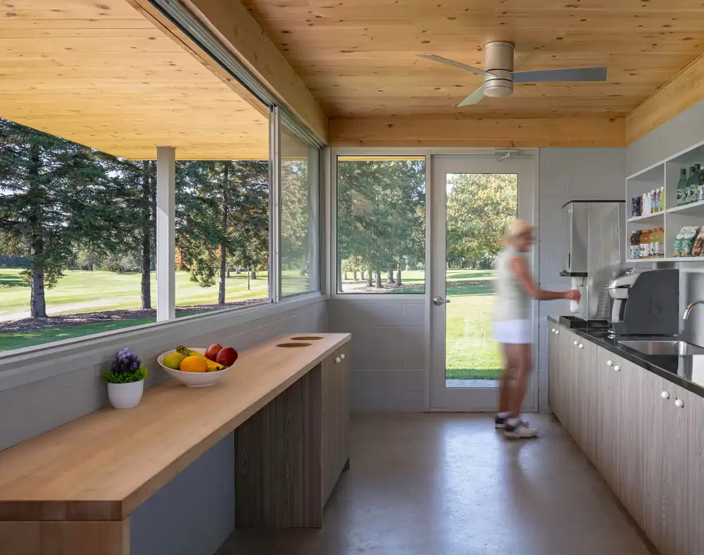 The pavilion was designed as a functional ‘folly in the park.’ Its low-lying, horizontal roof stands as a beacon for golfers, while giving visual priority to the surrounding trees, pond, and rolling greenery. Primarily intended for brief periods of rest, the pavilion’s siting and landscaping focus attention back onto the course: the structure and outdoor seating are oriented to provide views over the fairway and adjacent irrigation pond. The patio surrounding the pavilion echoes the roof’s outline, with pavers laid in a herringbone pattern that emphasizes material craftsmanship, creating a spacious, covered outdoor area that can comfortably accommodate larger groups. Inside, self-serve refreshment counters support an efficient pace, ensuring golfers avoid delays as they continue their game.