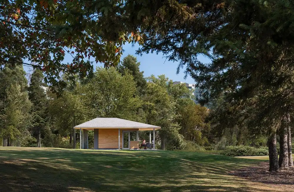 Since the pavilion is designed for seasonal use, typical HVAC systems were avoided, allowing the interior to connect more significantly with the exterior. Natural daylighting is maximized, and large operable windows facilitate cross-ventilation, further enhanced by ceiling fans for comfort—together reducing energy demands for lighting and climate control. Thermal insulation, air and vapor barriers, and conventional heating and cooling systems were omitted to suit its seasonal function, significantly lowering the pavilion’s carbon footprint. Instead of eavestroughs, rainwater flows off the roof into a river rock border around the structure, allowing it to permeate the ground and reduce runoff. The use of timber construction underscores a commitment to minimizing environmental impact.