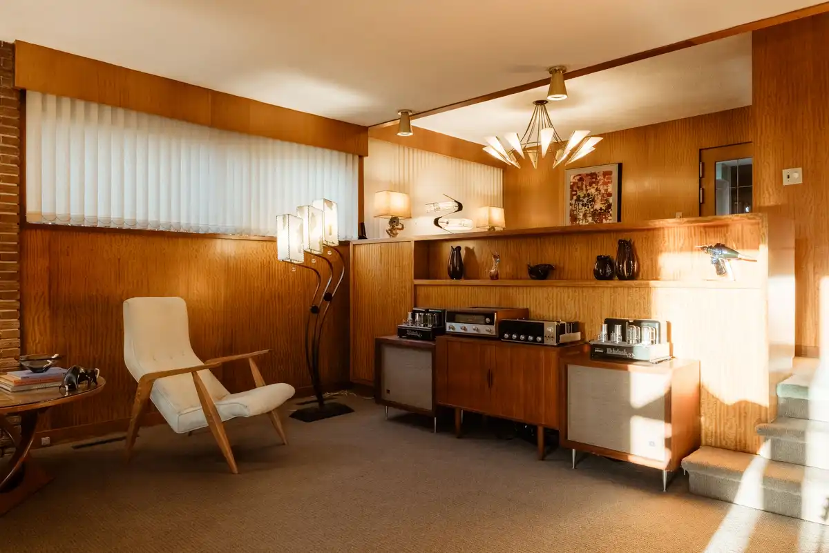 Inside, and down a few steps leading to a light-filled sunken living room, a warm, honey-hued world of expansive volumes and delicate design details unfolds, revealing what the house has been keeping intact. The home’s meticulous use of indigenous materials is typical of British Columbian Mid-century architecture, although not usually in these ample proportions. It is reminiscent of the luxurious detailing found in homes such as Frank Lloyd Wright’s Hollyhock House or Fallingwater.